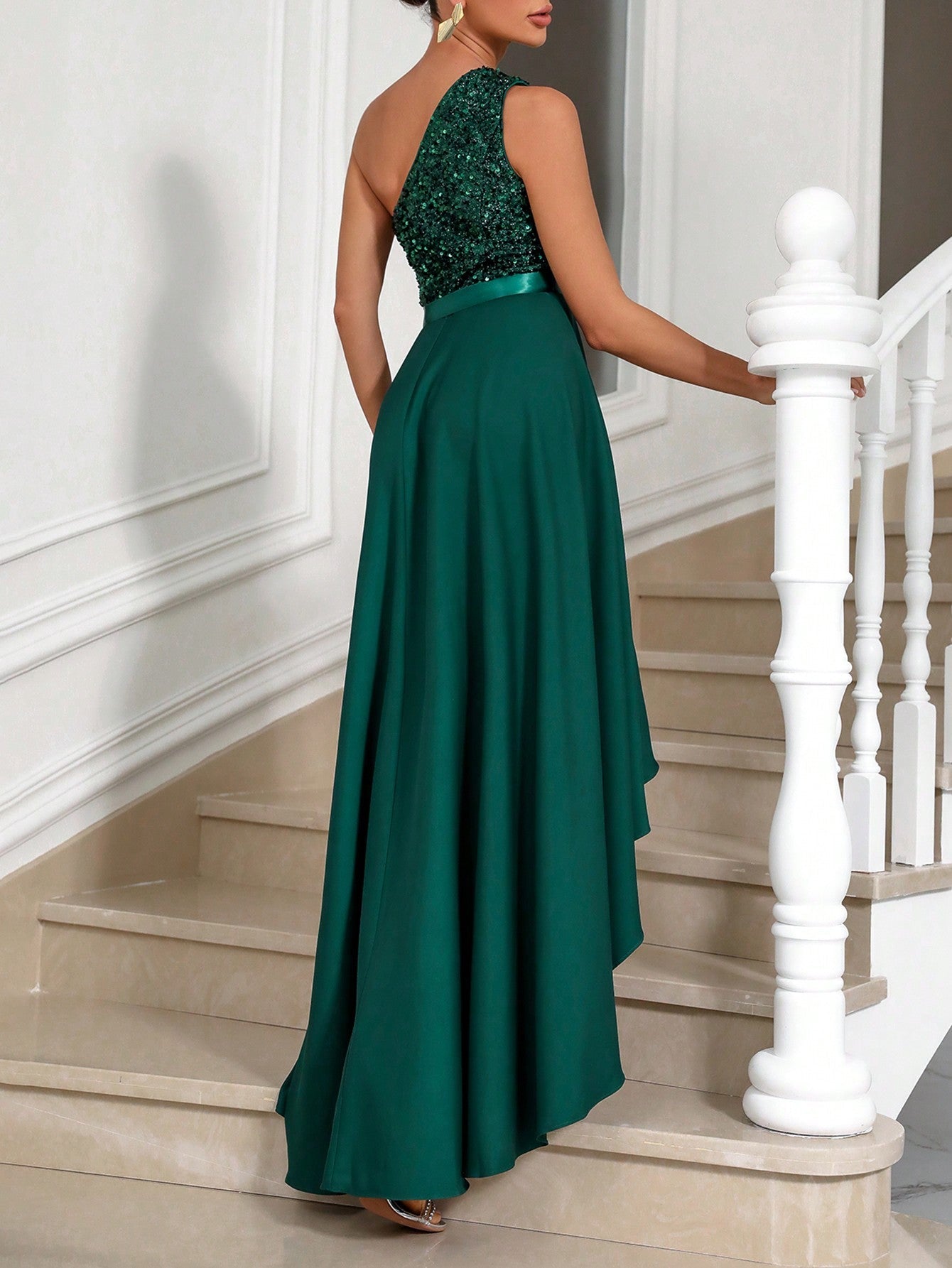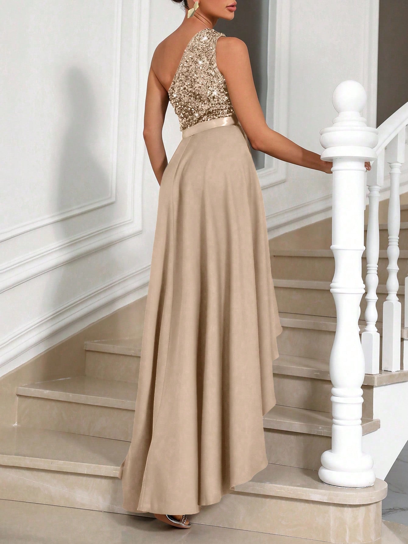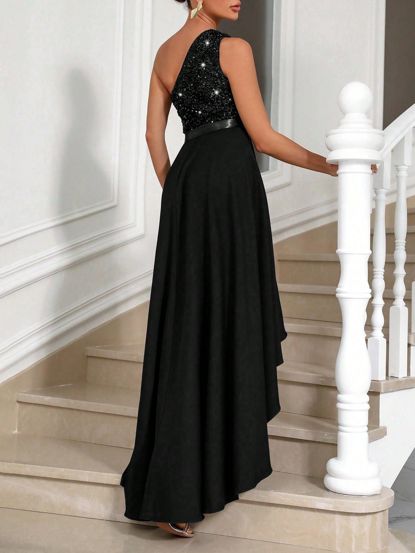 Vestito Aderente Con Spalla Obliqua Da Donna, Abbellimento Con Paillettes A Patchwork Asimmetrico Ed Orlo Sbieco