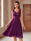 Vestito svasato da cocktail party in chiffon con inserti di paillettes e rifiniture a balze